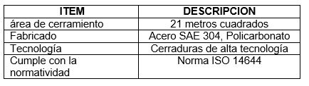 Encerramiento fabricado en acero inoxidable, policarbonato y alta tecnología, personalizado de 21 m^2 (metros cuadrados). Cuarto aséptico, libre de gérmenes y cualquier agente de contaminación. Cumple con la normatividad, establecida ISO 14644 “Encerramiento paletizadoras línea 1 y 2” (fecha entrada SDP 31 octubre 2017).