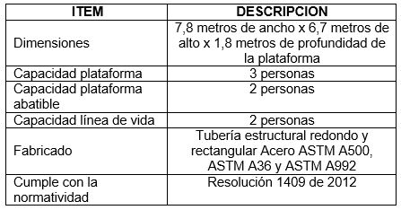 Diseño y fabricación de estructuras a la necesidad del cliente para labores de cargue, descargue de isotanques y camiones cisterna, además la inspección, lavado de camiones cisterna y cualquier otra labor en trabajo de alturas. Estructura fabricada en acero ASTM A36, ASTM A500 y ASTM A992
