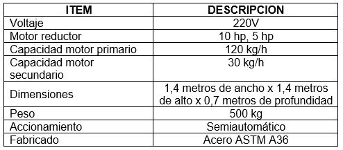 Diseñado y fabricado para moler suelas de poliuretano de un tamaño máximo de 26 centímetros de largo x 10 centímetros de ancho x 5 centímetros de grueso, cuenta con 2 etapas de molienda, (molienda gruesa y molienda fina) En la parte superior contamos con la molienda gruesa donde ingresa la suela completa, luego tomamos el producto de la molienda gruesa y lo pasamos por la molienda fina, obteniendo un producto más fino. Equipo fabricado en acero ASTM A36 y alimentación eléctrica a 220V.